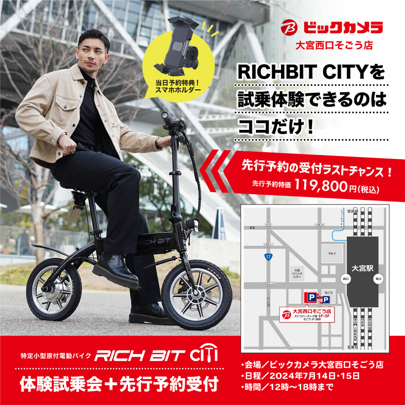 2024年7月14日(日)・15日(月)に「ビックカメラ大宮西口そごう店」にて特定小型原付電動バイク「RICHBIT CITY」の体験試乗会+先行予約受付イベントを行います。