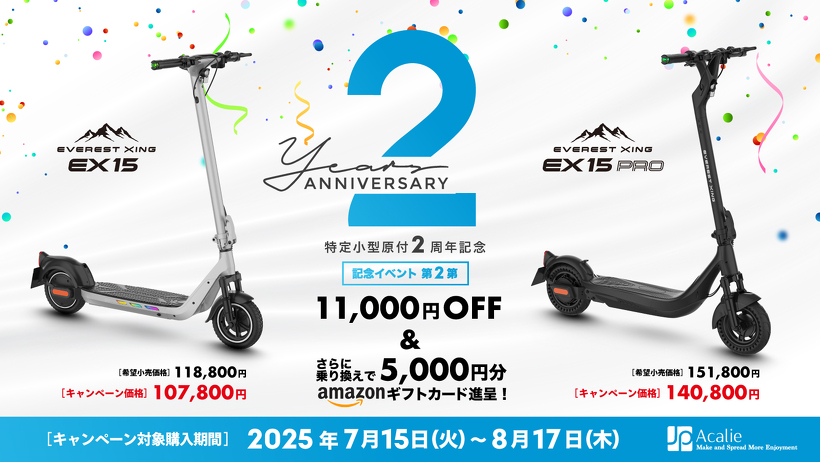 次世代型製品を展開する株式会社Acalie(本社:愛知県名古屋市、代表取締役:中友 孟涛、以下 Acalie)は、特定小型原動機付自転車(以下:特定原付)区分新設2周年である2025年7月1日(火)から、「安全・普及」をテーマとした特定原付2周年キャンペーンを開始します。